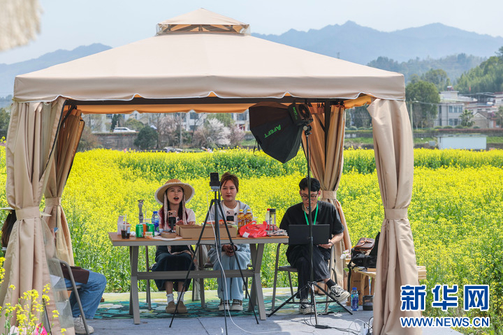 2025年3月23日,主播在浙江省建德市更楼街道城南城市田园油菜花田边的直播间内推介当地文旅项目。新华社记者 徐昱 摄