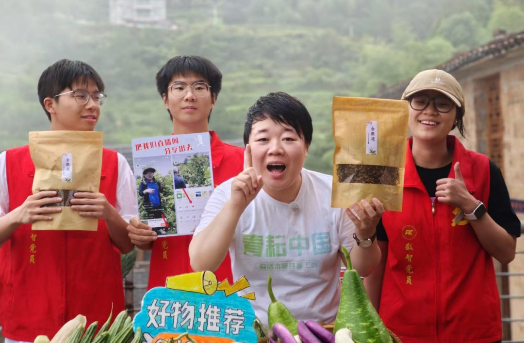 红E行实践队员在直播间推介农产品。