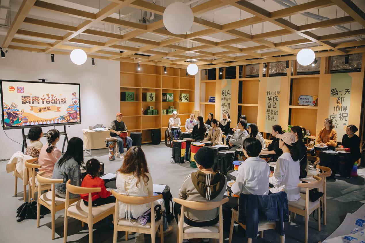 青年在夜校学习非洲鼓。