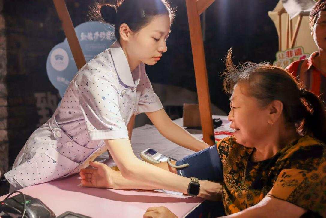 在舞台的另一侧,各个惠民摊位前人头攒动,各具特色的市集摊位吸引了大批群众驻足参与。在公益理发摊位前,胡和平和他的团队成员正在为老人修剪头发,娴熟的理发技艺赢得了现场群众的称赞。“医者仁心站”和“健康守护站”的医生为群众义诊。“非遗闪光站”里,在非遗传承人的带领下,小朋友们近距离体验了剪纸的魅力……