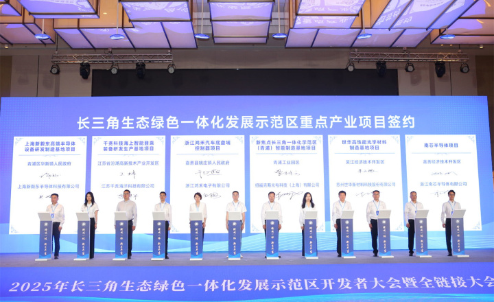 8月21日,2025年长三角生态绿色一体化发展示范区开发者大会暨全链接大会在浙江嘉善举行。大会聚焦“跨域一体·新质共生”主题,现场签约9个重点项目,总投资额达87.22亿元。