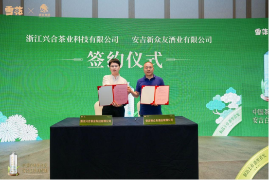 签约仪式上,浙茶集团旗下浙江兴合茶业科技有限公司总经理夏兵与华润雪花渠道商代表安吉新众友酒业有限公司总经理陈亮签署了联合市场拓展协议,双方将围绕安吉白茶精酿啤酒,共同推进渠道建设与区域协同推广。