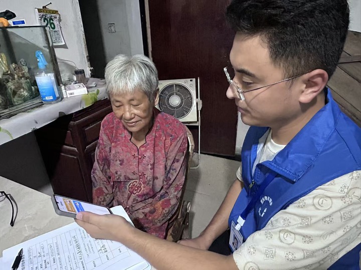 8月26日,绍兴市医保部门工作人员上门指导诸奶奶线上申请异地长护险。新华社记者 黄筱 摄