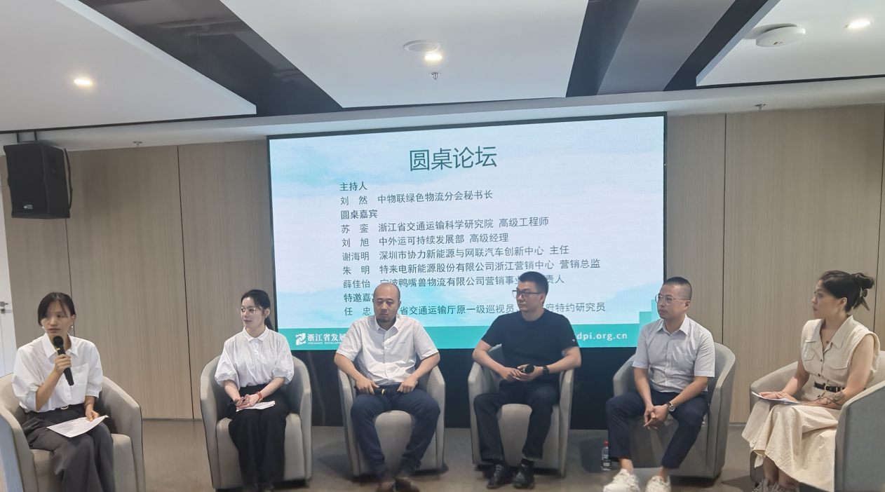 圆桌论坛由中物联绿色物流分会秘书长刘然主持,浙江省交通运输科学研究院高级工程师苏銮、中外运可持续发展部高级经理刘旭、深圳市协力新能源与网联汽车创新中心主任谢海明、特来电新能源股份有限公司浙江营销中心营销总监朱明、宁波鸭嘴兽物流有限公司营销事业部负责人薛佳怡五位嘉宾,围绕新能源重卡的“实践痛点、场景拓展、政策需求”展开深度对话。