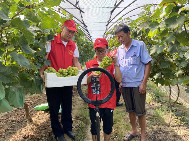 志愿者在葡萄架下开展助农直播。