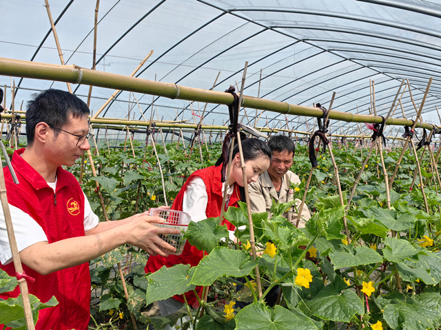 但黄瓜的最佳采摘期很短,一旦长到合适大小,就得及时采摘、整理、上市,不然就会过老影响口感。对于青壮年多外出务工的桃园村来说,人手少、时效强,收瓜成了时令“硬仗”。每到这时,嘉兴市烟草专卖局的“香溢”志愿服务队除了完成日常工作外,他们会挤出时间和村里的乡亲们一起忙活、抢丰收。队员们拎着竹篮、推着小推车钻进菜园。