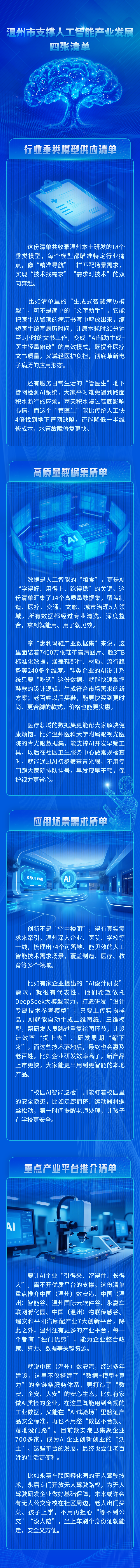 这四张备受瞩目的清单究竟包含了哪些具体内容?它们又将如何破解产业发展难题,为温州人工智能发展注入新动能?通过下面这张长图,带您“图”个明白,一览温州为打造“人工智能创新发展先行市”所绘就的清晰路径与提供的坚实支撑。(胡炎桢 黄佳/文 温州市委宣传部/供图)