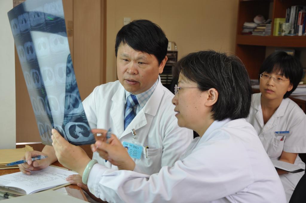 徐兵河(左一)在查房时指导科室医生读CT片并制定治疗方案。(本人供图)