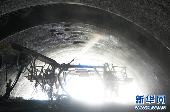 9月17日,建设者在甬舟铁路陆家二号隧道贯通后对上台阶初期支护喷射混凝土作业。