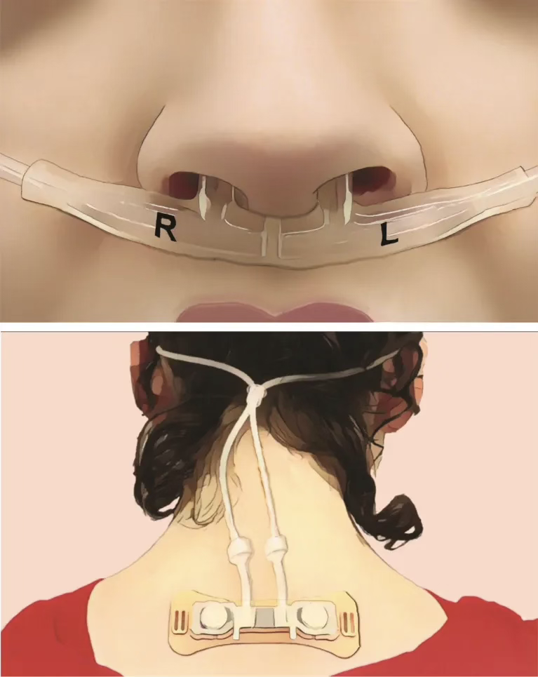 为了验证这一设想,在一篇不久前(2025年7月7日)发表于《当代生物学》的研究中,研究人员招募了100名健康的年轻成年人参与实验,并要求参与者在24小时内佩戴一款定制的可穿戴设备。这个设备主体固定在颈背,鼻下延伸出两根柔性导管,可分别记录左右鼻孔的气流变化,连续采集长达 24 小时,同时几乎不影响日常生活。由于其中有3人的数据受损,最终分析纳入了97人的数据。