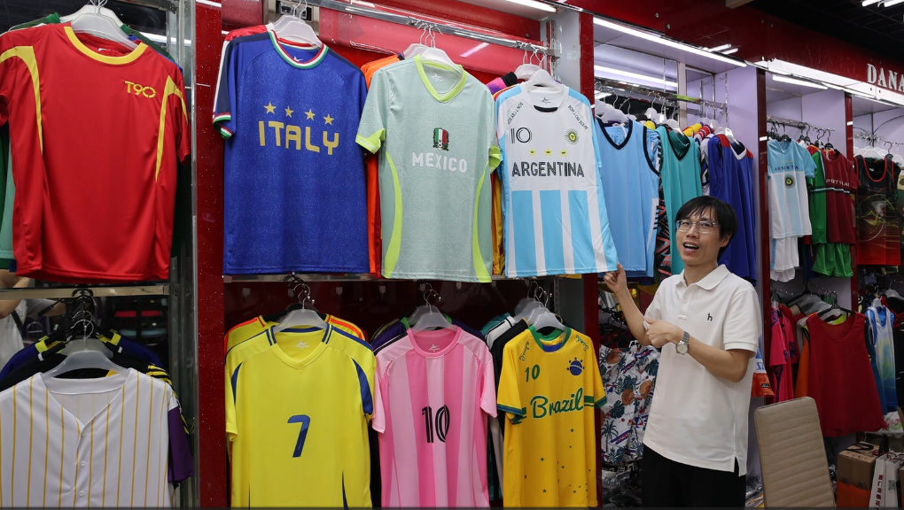 义乌国际商贸城经营户凌天乐为2026年美加墨世界杯设计的助威加油喇叭。新华社发
