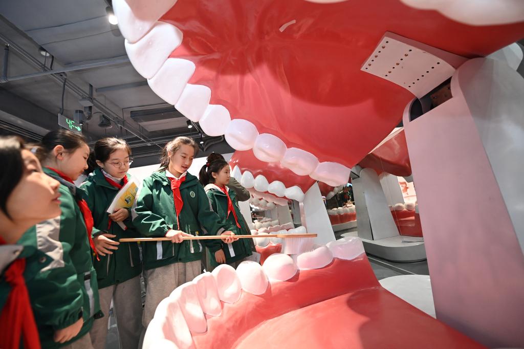 陕西省西安市新城区通济坊小学的学生在西安交通大学口腔医院口腔科普教育基地学习正确的刷牙方法。新华社记者 李一博 摄