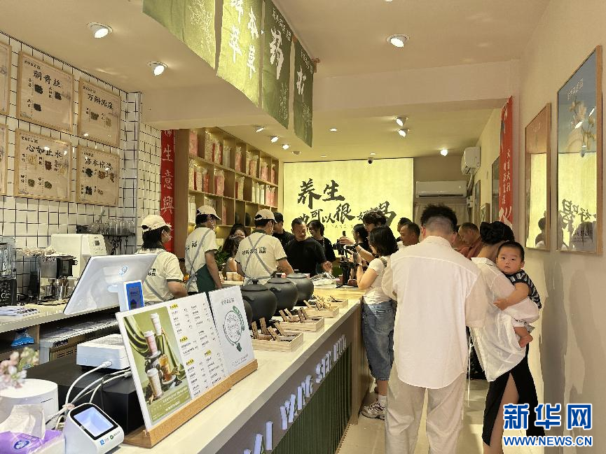 2025年8月1日,耐养森活·江南药镇草本茶饮店新店在浙江省东阳市开张。新华网发(黄莉萍摄)