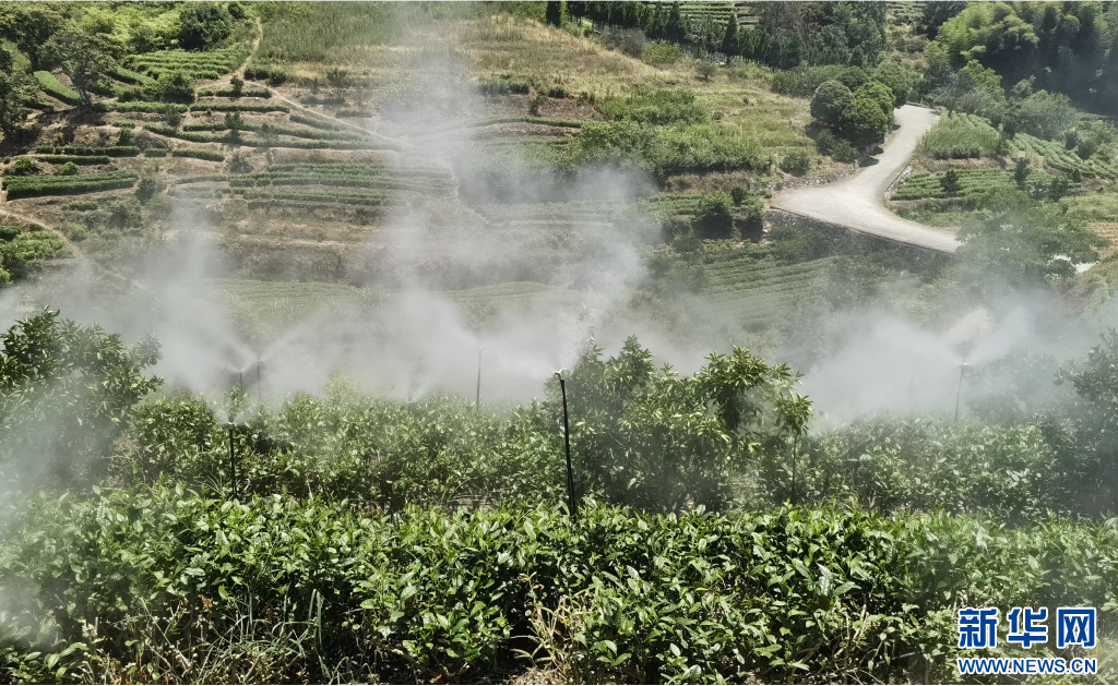 茶园里,自动喷灌设备正在作业。新华网发(松阳县宣传部供图)