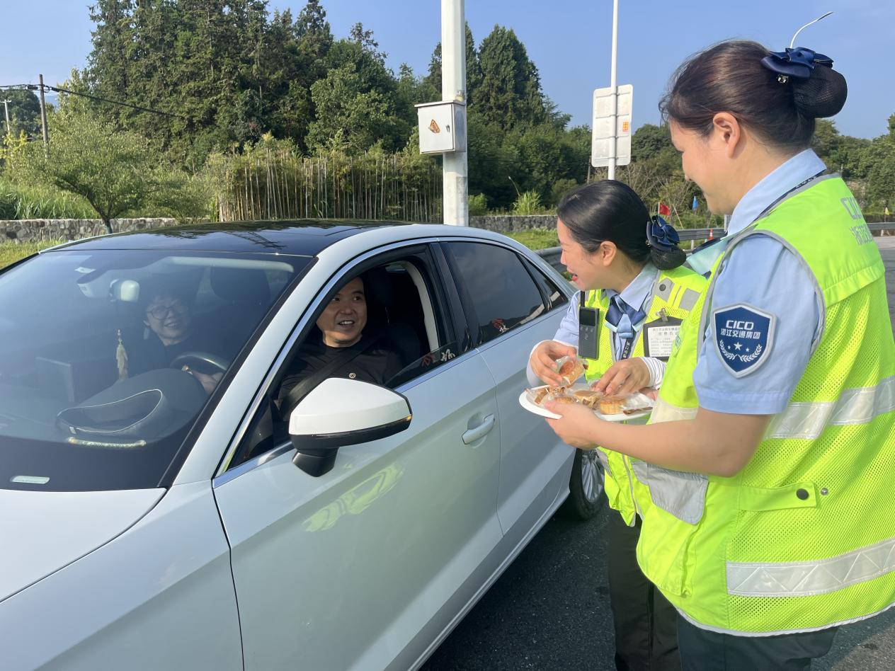 “师傅,中秋快乐,一路平安!”10月4日,中秋佳节将至,浙江省交通集团杨林收费站外广场暖意融融。车辆缓缓驶出车道,志愿者们将一份份承载着心意的月饼递入车窗。
