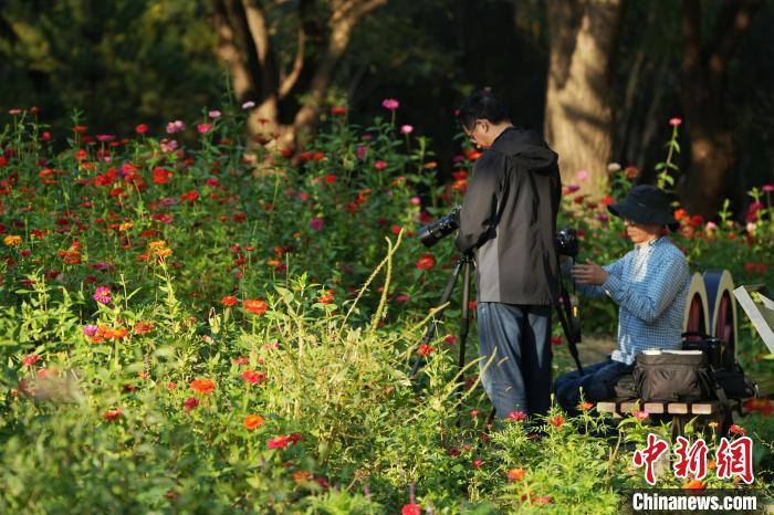 资料图:寒露至,北京秋高气爽,市民在南苑森林湿地公园拍摄百日菊。中新社记者 张祥毅 摄