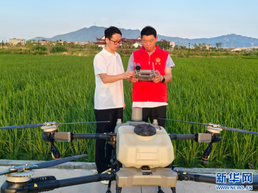 三位一体·共富工坊负责人指导工坊工作人员使用无人机喷洒农药。新华网发(龙港市委组织部供图)