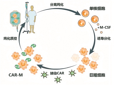图为肿瘤患者自体来源嵌合抗原受体巨噬细胞的制备和回输示意图。 受访单位供图