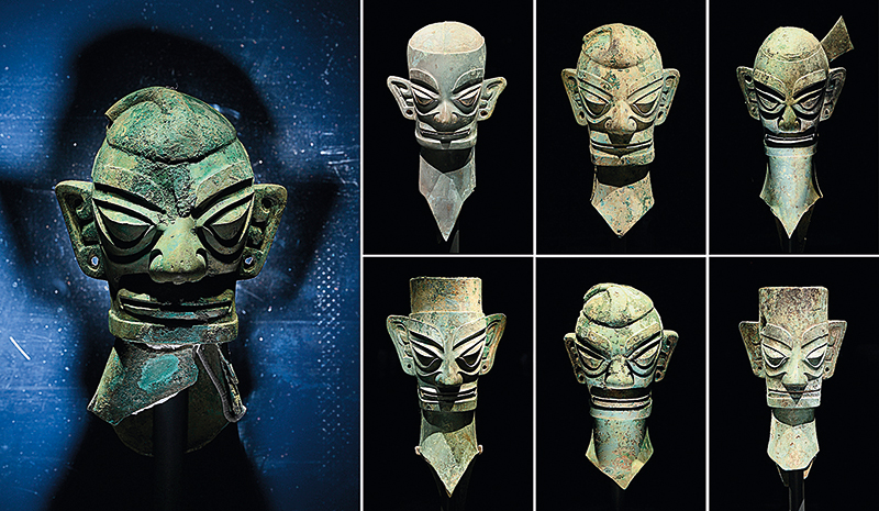 2021 年出土于三星堆 3 号祭祀坑的青铜人头像(左一)和 2022 年出土于三星堆 8 号祭祀坑的青铜人头像(2024 年 12 月 19 日摄) 李贺摄 / 本刊