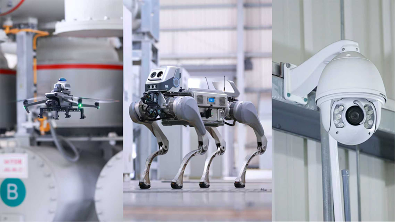 无人机飞行于设备高处与缝隙,精准判断刀闸状态,实时监测关键部位温度,识别精度达±0.1℃。机器狗深入视觉死角,精准采集液压油位、SF6压力等20多类数据,实现巡检点位100%覆盖。50余处高清摄像头构建起24小时不间断立体监测网络,典型异常识别准确率达98.5%。