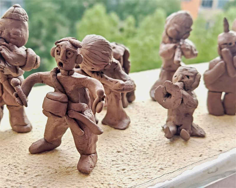 “我捏的是一个吹唢呐的老爷爷,我觉得他的胡子最有意思,我用小木棍一点点划出了胡须的纹理。”学生开心地介绍着。