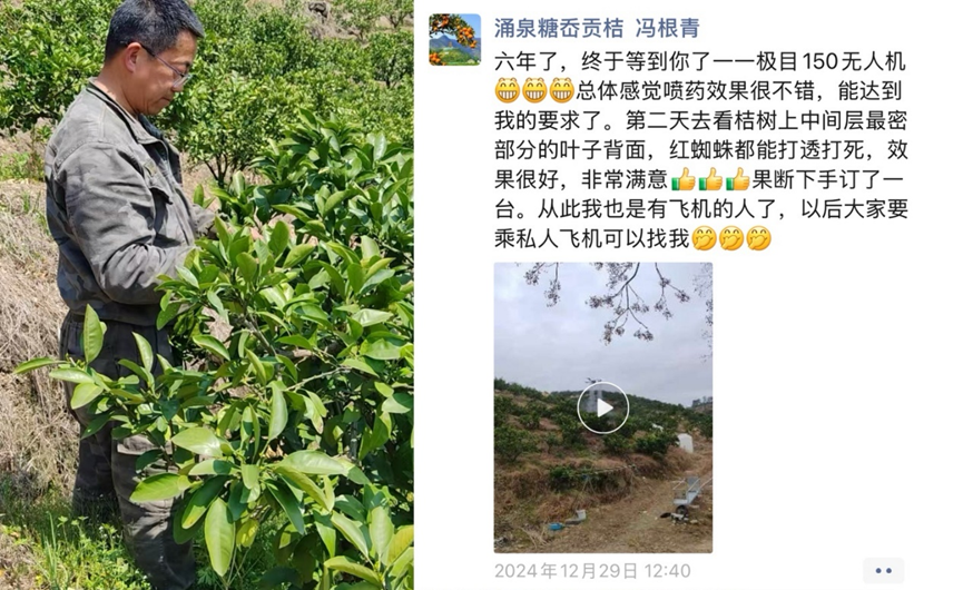 去年底,浙江台州农户冯根青使用极目科技J150植保无人机高效完成自家蜜桔园的清园工作,他连发三条朋友圈,对极目无人机的肯定简直溢出屏幕。