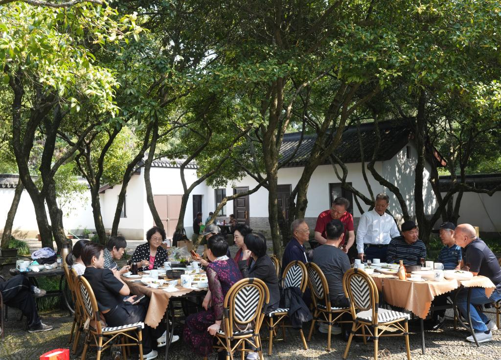 游客坐在满觉陇的桂花树下用餐。新华社记者 翁忻旸 摄