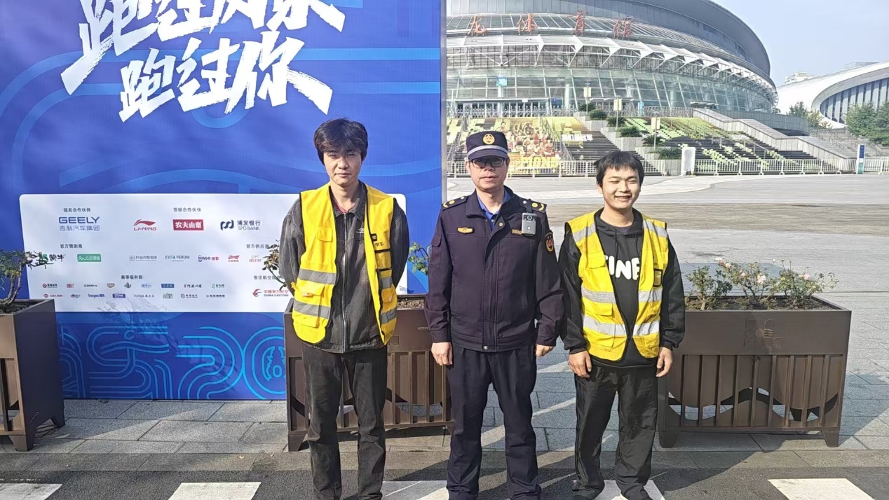 灵隐街道综合行政执法队员和美团单车运维在赛事现场联合保障。方强/摄