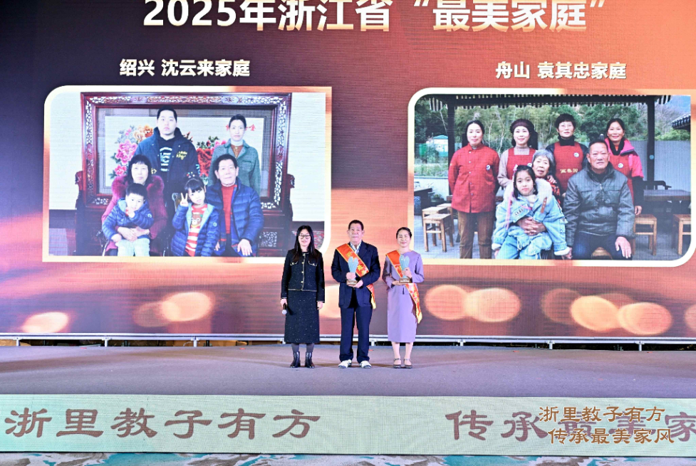 现场发布了2025年浙江省“最美家庭”名单,杭州竹书鸿家庭、宁波竺士杰家庭、温州应颂书家庭、嘉兴赵巧娟家庭、绍兴沈云来家庭、金华郭爱君家庭、衢州阮小华家庭、舟山袁其忠家庭、台州徐海荣家庭、丽水杨建林家庭等10户家庭光荣入选。活动特邀往届各类先进家庭代表为获奖家庭颁授荣誉杯。这一“前辈授誉、新人接棒”环节,不仅是对家庭美德的崇高致敬,更生动诠释了“最美”精神在之江大地代代传承。