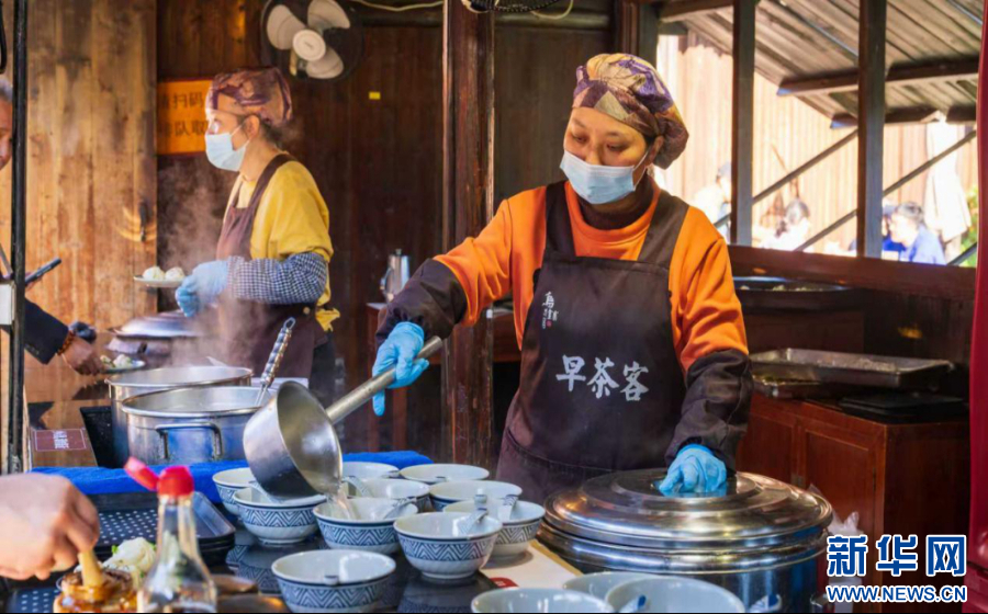 住在乌镇的游客,仅需提前一天在小程序预约,第二天清晨来到水上集市,在江南的晨雾与橹声中开启一顿地道早餐。新华网发