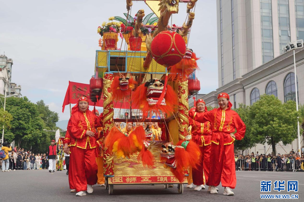 11月8日,在丽水市莲都区巡街现场,海潮线拉狮子队登场,以“翻云梯”等高难度动作展演传承自唐代的舞狮技艺。新华网发 丽水市新闻传媒中心供图