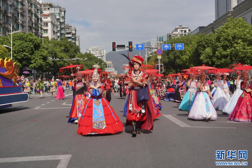 11月8日,在丽水市“非遗巡街”活动中,景宁方阵表演畲族婚俗与服饰秀,民族歌舞互动拉近与观众的距离。新华网发 丽水市新闻传媒中心供图