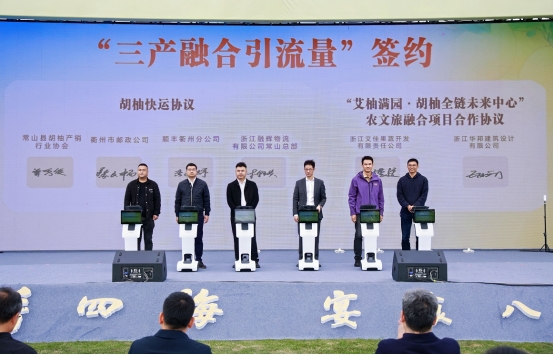 同时,在“三产融合引流量”签约仪式中,常山县胡柚产销行业协会与衢州市邮政公司、顺丰衢州分公司、浙江融辉物流有限公司签订了胡柚快运协议,浙江艾佳果蔬开发有限责任公司的“艾柚满园·胡柚全链未来中心”农文旅融合项目也提上日程。“物流企业保驾护航,农文旅项目深度融合,让胡柚从‘枝头’到‘心头’的路径更通畅、体验更丰富。”常山县农业农村局胡柚产业发展中心主任汪丽霞表示。