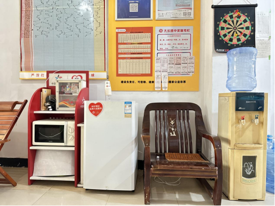 推开这家店的玻璃门,除了熟悉的彩票店基础设施,更显眼的是墙角的“便民暖心角”。一沓沓体彩公益宣传资料旁,摆着几本书籍供人翻阅;遍布天花板的足球元素装饰、飞镖玩具、跳绳等,洋溢着体育活力;针线盒、血压测量仪、打印机等随时待命,方便临时应急。炎热夏季,它是“清凉站”,免费提供解渴饮水、避暑休息、防暑物资;严寒冬日,便摇身成了“小火炉”,为在外奔波的户外工作者们加热饭菜、倒满热水。
