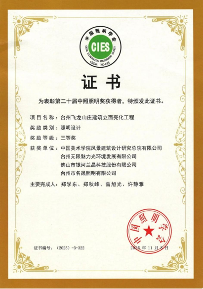 近日,照明领域权威奖项“第二十届中照照明奖”名单揭晓,浙江台州飞龙山庄建筑立面亮化工程获得照明设计类三等奖。