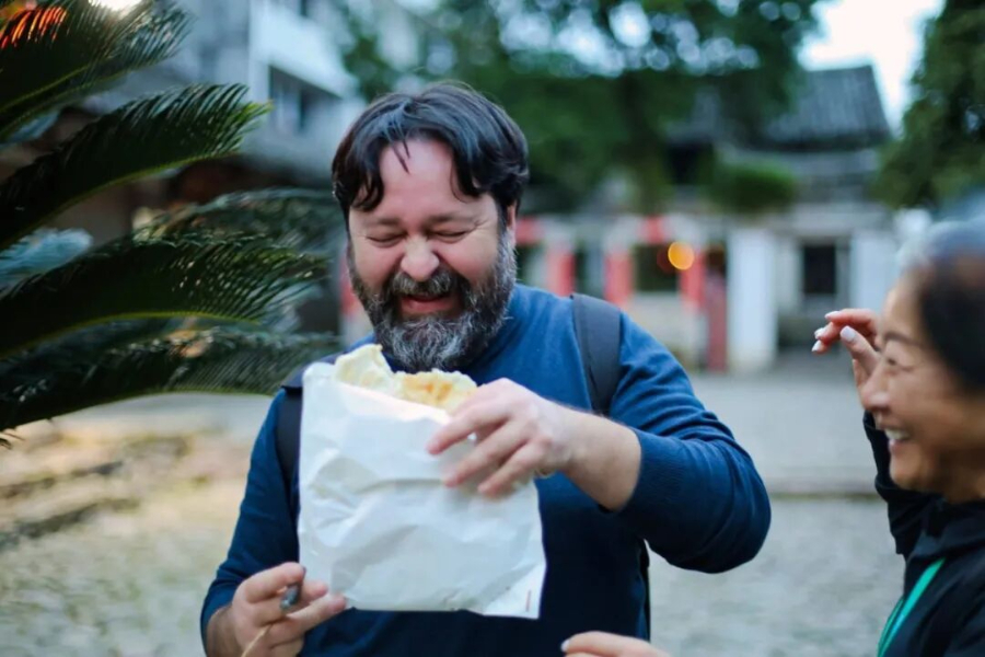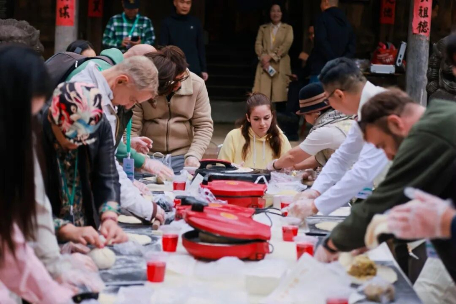 山水之间藏烟火,古村深处品文化。随后,代表团走进芙蓉古村,亲手体验温州特色美食——麦饼的制作。从和面、包馅到烙制,大家兴致勃勃。一位意大利旅行商巧妙融入家乡手法,以制作披萨的经验擀制麦饼,并笑称:“这就像中国的‘创意披萨’,外脆里香,非常美味!”现场气氛热烈,笑声不断。