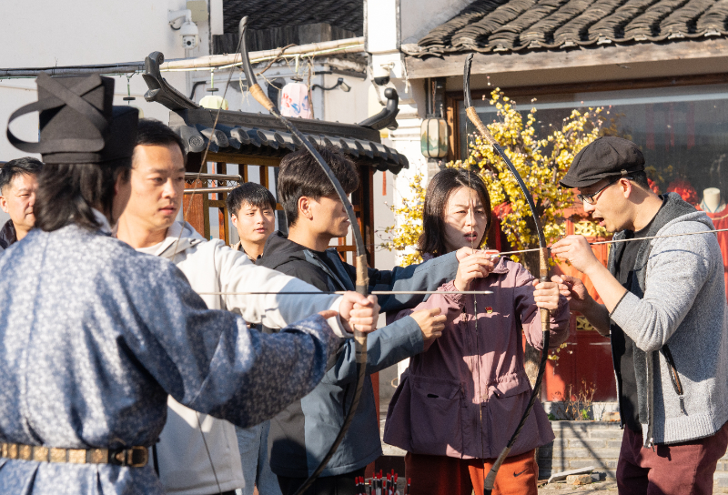 签约挂牌后,活动瞬间“穿越”到了“古代”。在工作室导师专业指导与学院教师积极参与下,党员师生和学生们共同体验汉服文化与射礼文化。大家试穿不同朝代的精美汉服,感受华夏衣冠礼仪的深厚内涵;亲身参与传统射礼演练,领悟“发而不中,反求诸己”的修身自省精神与礼射中和之美。生动的互动体验让抽象传统文化变得具体可感,师生们在实践中深刻感悟中华优秀传统文化魅力,增强文化自信,同时也促进了师生间的情感交流与思想碰撞。
