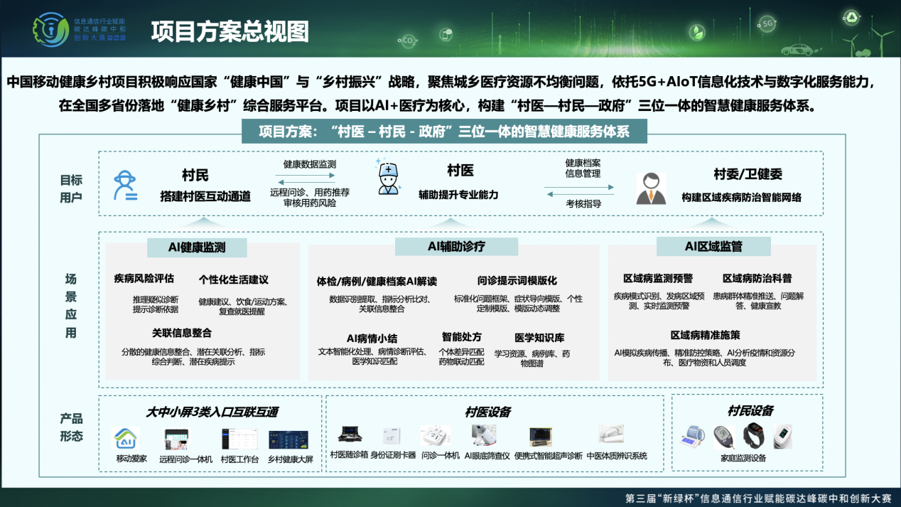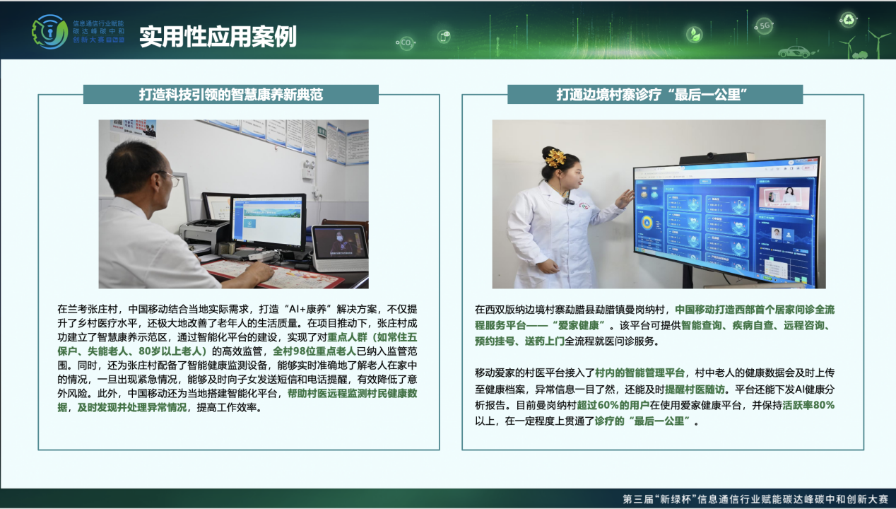近日,由中移(杭州)信息技术有限公司牵头实施的“中国移动健康乡村赋能基层医疗普惠实践绿色低碳发展”案例,在第三届“新绿杯”信息通信行业赋能碳达峰碳中和创新大赛中脱颖而出,获全国赛优秀奖。中国移动健康乡村项目深入贯彻落实国家“健康中国”与“乡村振兴”战略要求,勇于承担央企科技创新与为民服务的社会责任与数字使命,以“AI+乡村医疗”为核心,构建“村医—村民—政府”三位一体的智慧健康服务体系,为打通基层医疗“最后一公里”,探索绿色低碳的乡村医疗可持续发展新路径实现,提供了兼具前瞻性与实效性、可复制、可推广的数字化实践范例。