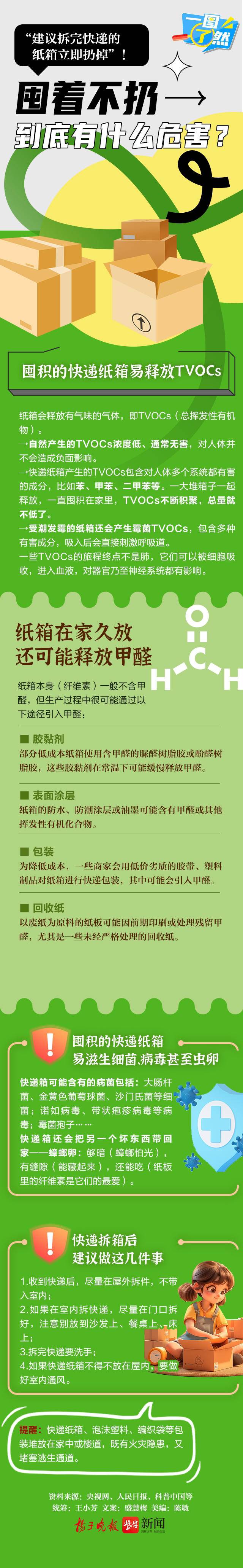 “双十一”的货刚收齐,“双十二”眼瞅着又要开始了,家里的快递逐渐多了起来。最近,话题“建议拆完快递的纸箱立即扔掉”冲上热搜。快递纸箱囤着不扔,到底有什么危害?