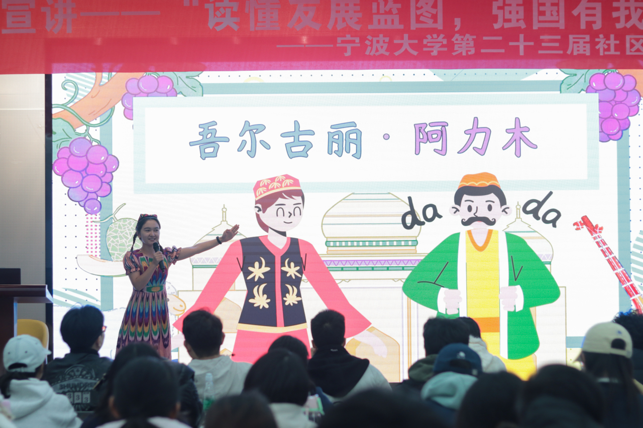 活动中,两位大学生宣讲员也进行了展示。来自新疆的吾尔古丽·阿力木伴随着民族音乐登场,她从汉字“和”展开,结合全球文化交往的实际,诠释了“高水平对外开放”的深刻内涵。
