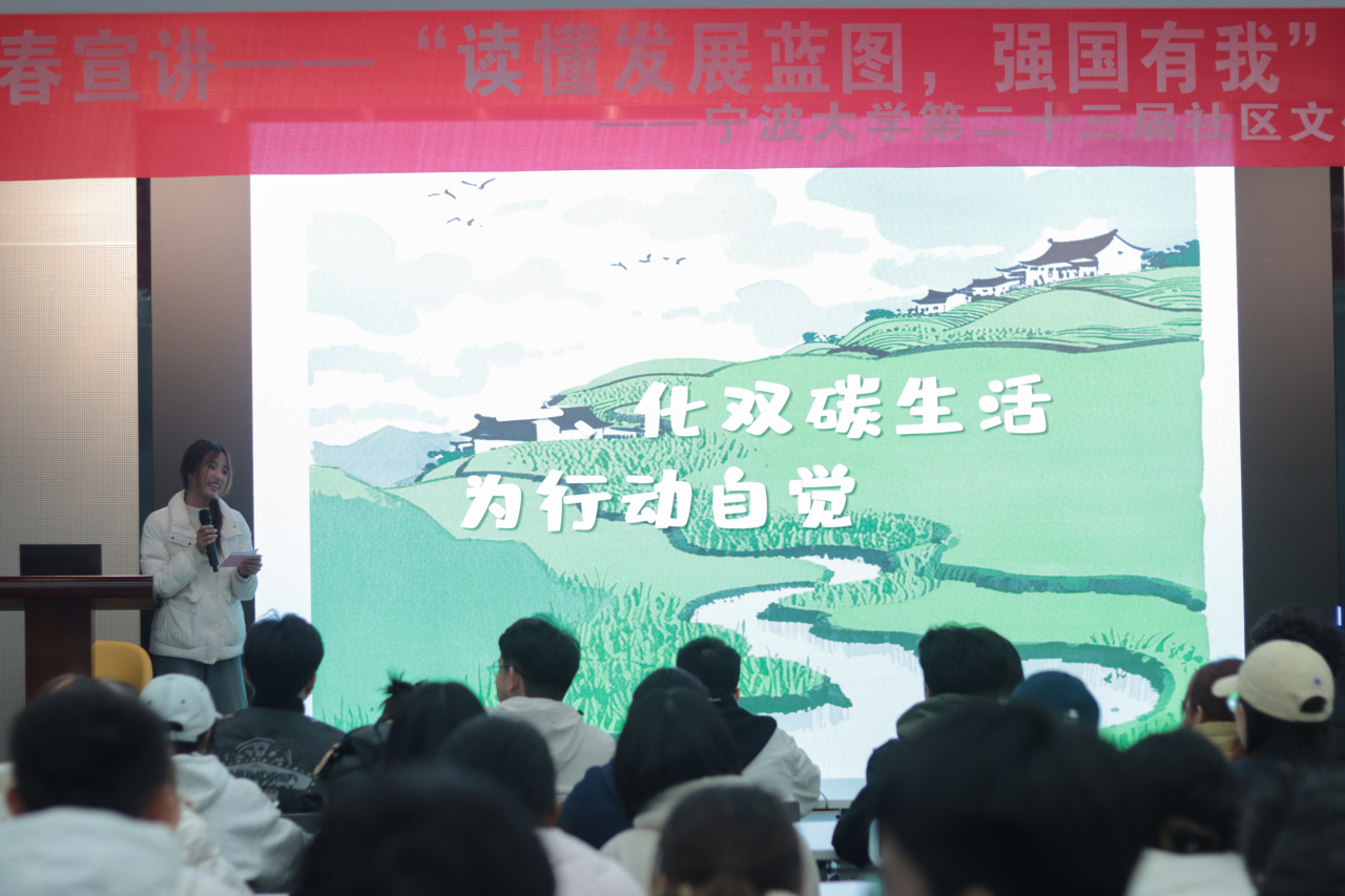 “北岸·星火”青年宣讲员曾玲欣则将外卖点餐界面投射到大屏幕,呼吁同学们从日常小事入手,积极参与国家绿色转型。她贴近同辈、贴近现实的讲述方式,给人留下深刻印象。