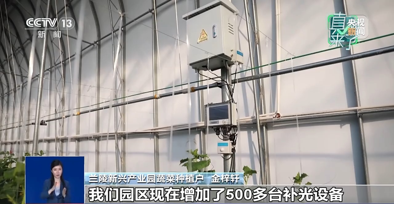 兰陵新兴产业园蔬菜种植户金梓轩:黄瓜是典型的反季节蔬菜,冬季每天的光照要比夏季少3个小时左右。我们园区现在增加了500多台补光设备。充足的光照可以使花期开花旺盛,花期延长,同时能促进果实的光合作用的积累,能使果实更加爽脆。现在我们冬季的亩产在10000斤左右,基本能跟夏季持平。