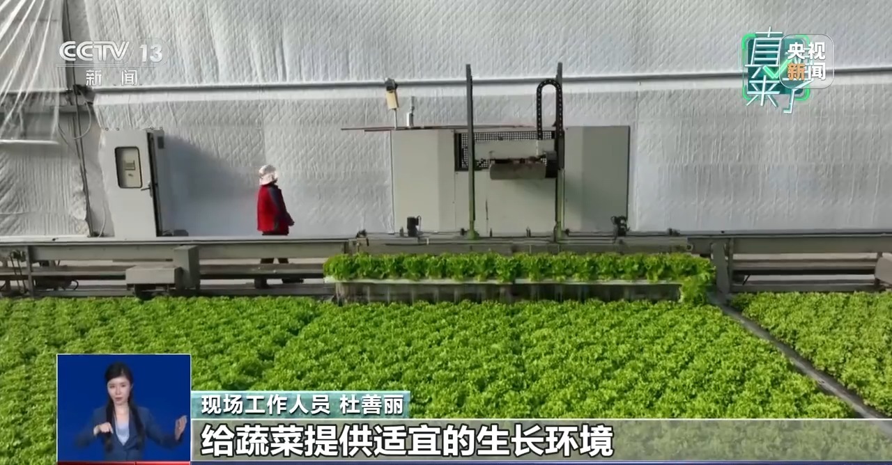 现场工作人员杜善丽:我们园区里有湿度、温度等四类监测设备,300多个探头。生菜适宜的温度8℃~25℃,当温度达不到生菜适宜生长温度时,加热系统会自动启动。园区里有3000多米长的加热管道,就像家里的暖气一样,给蔬菜提供适宜的生长环境。