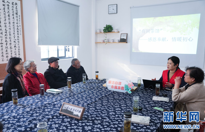 12月11日,在浙江省嘉兴市南湖区电子社区“有间茶馆”内,社区党员志愿者(右二)听取关于社区事务的意见和建议。