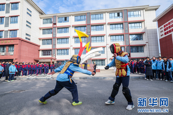 12月16日,轧村中学的学生们在阳光大课间活动中进行武术短兵训练。