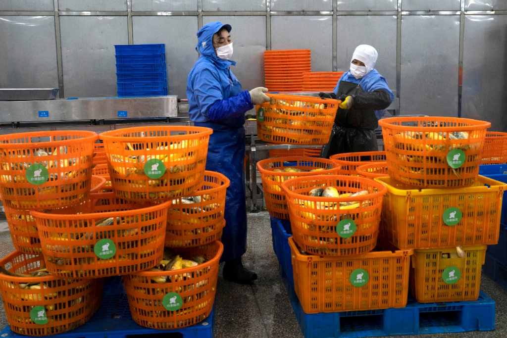 车间工人正在分筛处理大黄鱼。新华社发