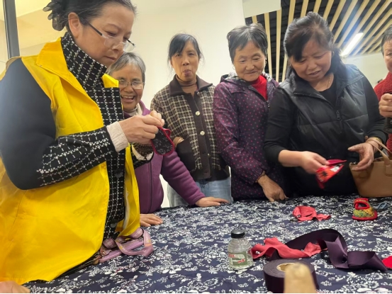 前期,康乾街道统战工作人员通过入户走访、座谈交流,了解到不少中老年居民、返乡妇女对既能居家操作、又有市场认同的手工技能存在较强需求。结合德清非物质文化遗产传承与活化利用的整体规划,最终选取了贴近日常生活、承载一代人记忆的老布鞋制作作为培训项目,设计了“文化讲解+实操演练+产品推广”的渐进式课程体系。