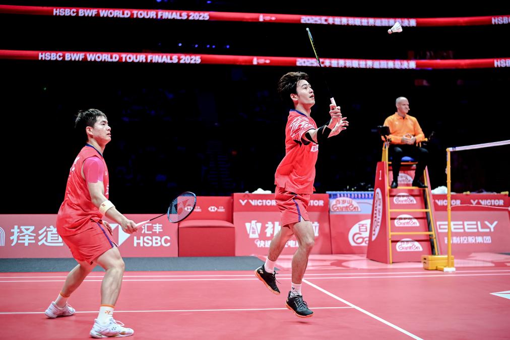 12月21日,中国组合梁伟铿(左)/王昶在决赛中。当日,在杭州进行的2025世界羽联世界巡回赛总决赛男子双打决赛中,中国组合梁伟铿/王昶0比2不敌韩国组合金元昊/徐承宰,获得亚军。新华社记者 江汉 摄