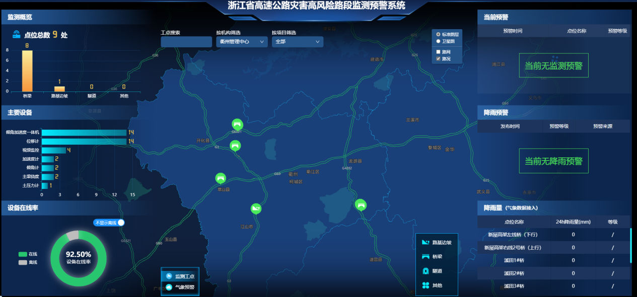 浙江省交通集团高速公路衢州管理中心管辖的高速路段多位于山区,桥隧占比高,其中桥梁803座。桥梁多跨越峡谷沟壑,跨度大、地形复杂,加之梅雨季多雨、台风季风力大,给桥梁养护带来诸多挑战。针对这一情况,浙江省交通集团高速公路衢州管理中心率先推进桥梁智能监测预警试点工作,在桥梁关键部位安装了40余套应变传感器、位移监测器和高清视频监控设备。这些设备如同“智能哨兵”,能抵御山区潮湿、强风等恶劣环境影响,实时捕捉桥梁倾斜震动、结构沉降、墩台位移等细微变化,再通过物联网技术将数据实时传输至云端平台,实现24小时不间断监测。
