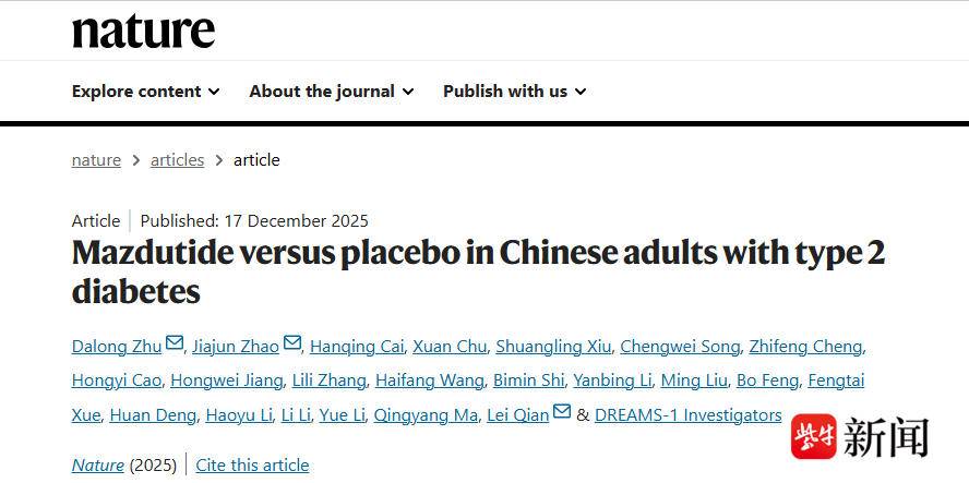 这一发现为2型糖尿病的临床治疗提供了重要的策略。研究成果以“Mazdutide versus placebo in Chinese adults with type 2 diabetes”为题,在2025年12月17日发表于国际顶级期刊Nature。